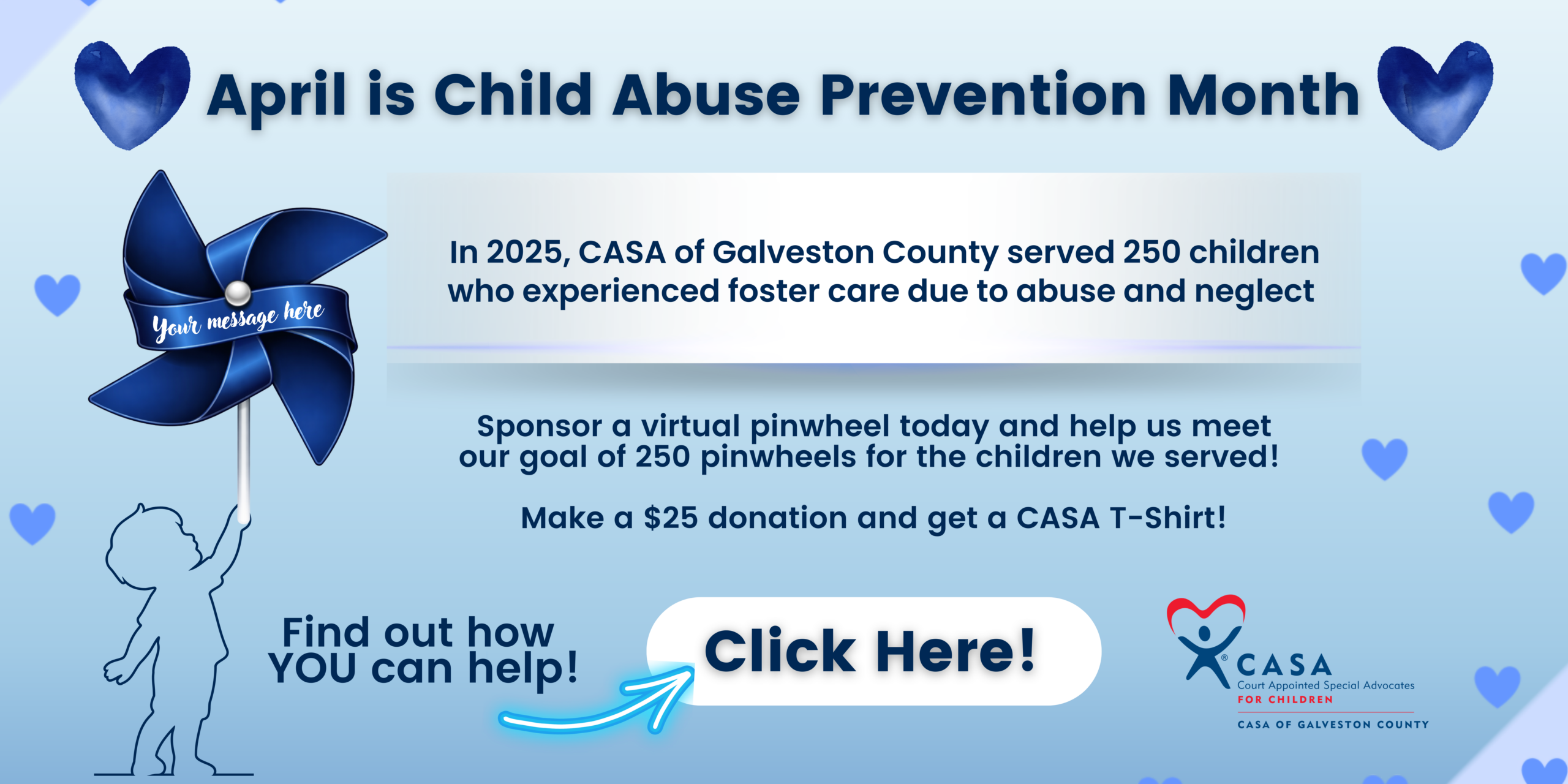 CASA of Galveston County is dedicated to recruiting, training and supervising community members to advocate for children experiencing foster care. Volunteer advocates are the consistent presence in these children’s lives when they need it the most. Learn more how you can make a difference!
